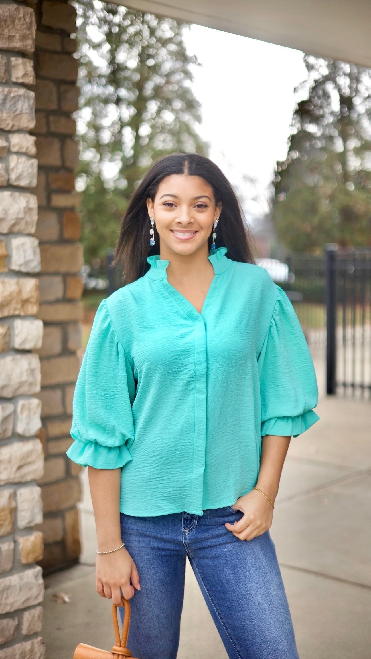 The Sarah Button Up Blouse in emerald is your go-to piece for effortless versatility. This charming blouse transitions seamlessly from casual weekend wear to polished office looks, making it a wardrobe essential. The rich emerald hue adds a sophisticated pop of color that flatters any complexion, while the classic button-up silhouette keeps things timeless and refined. Layer it over a tee, tuck it into your favorite jeans, or dress it up with tailored trousers—this adorable blouse does it all with understated elegance.