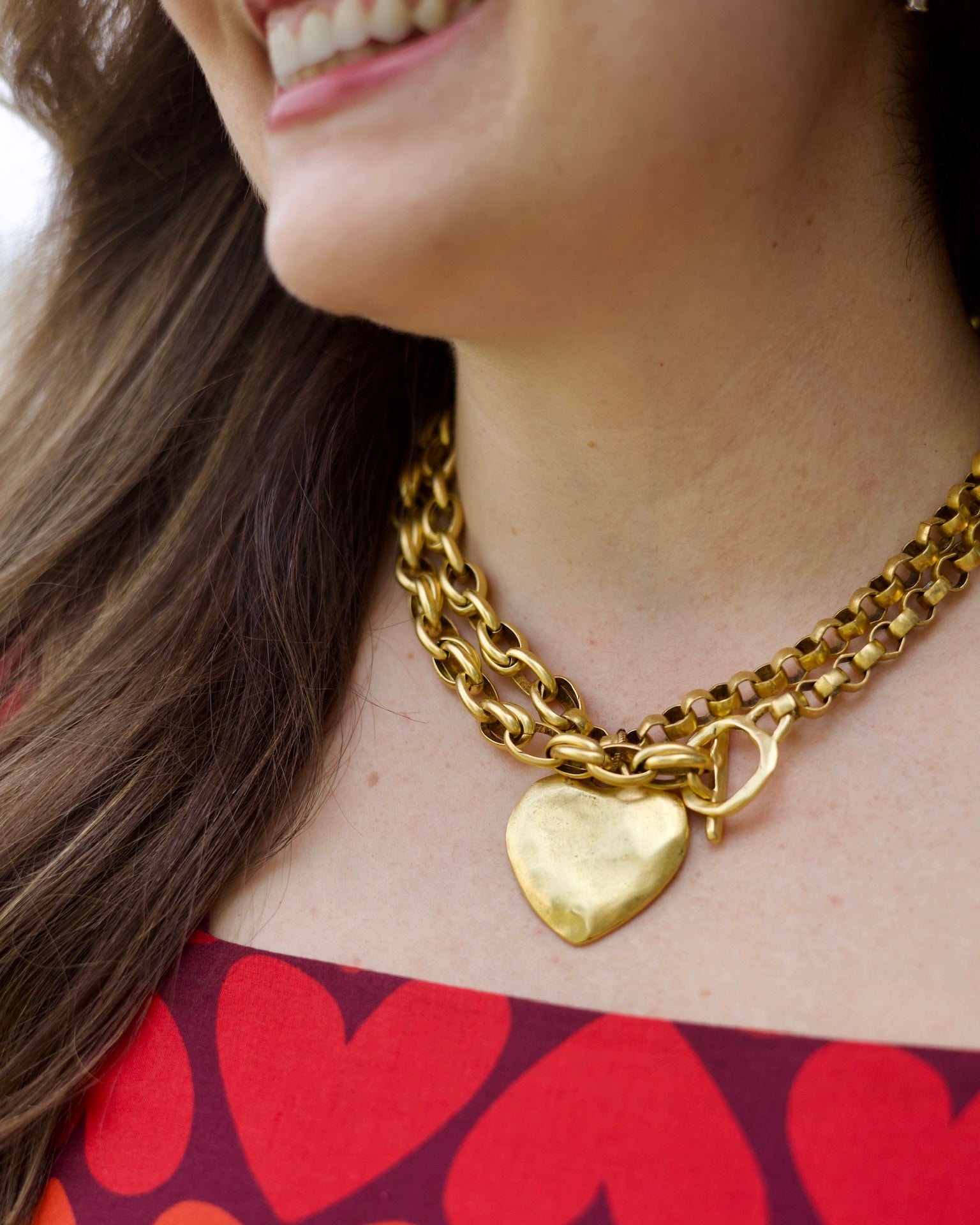 Add a playful pop to your outfit with Ave's Way Wrap Large Heart Necklace. This trendy necklace features a large gold chain and a cute heart pendant, perfect for bringing fun and charm to your everyday style.