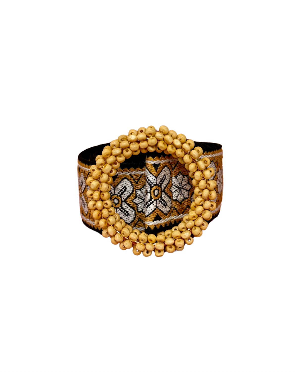 Add a pop of playful color to any outfit with this black belt featuring cheerful mustard and white details. The fun design is perfectly complemented by a unique beaded buckle, making it a standout accessory that brightens your look while keeping things stylish and secure.
