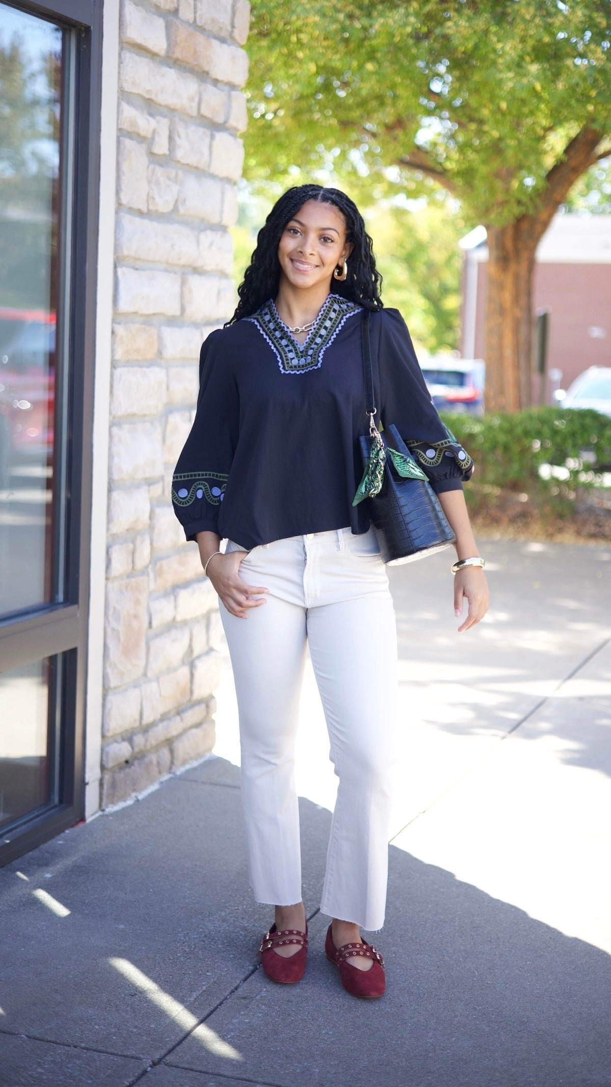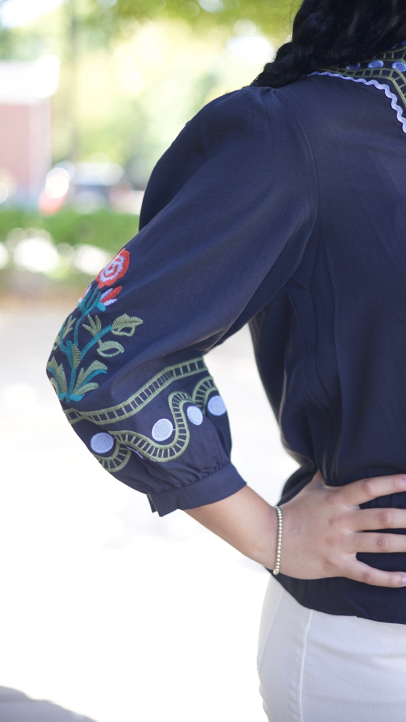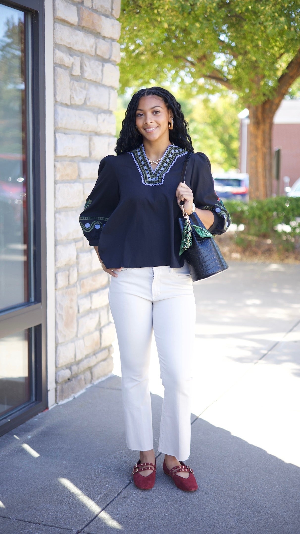 The Emmy Top is a stylish fall essential featuring a black body with long periwinkle floral sleeves accented by charming ric rac trim. This chic design offers a cute and elegant look perfect for layering or wearing on its own during cooler days, bringing a fresh and fashionable touch to your wardrobe.