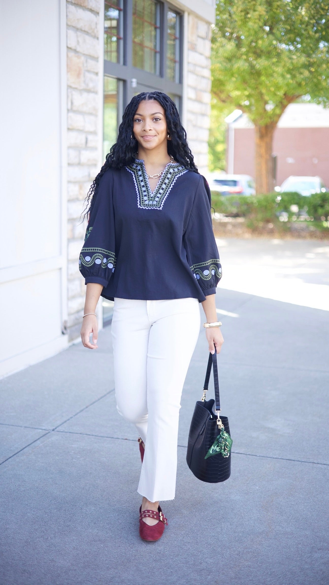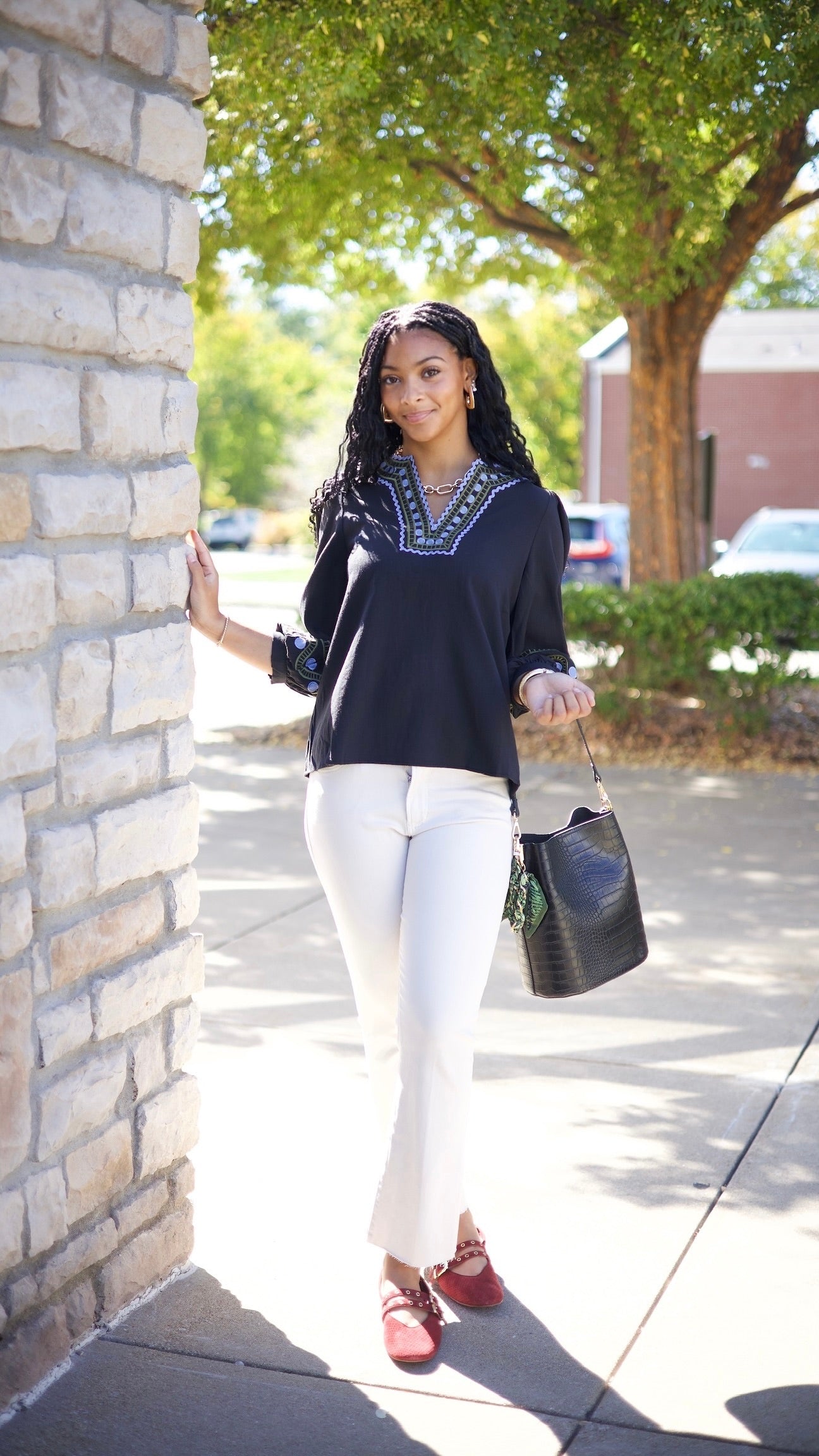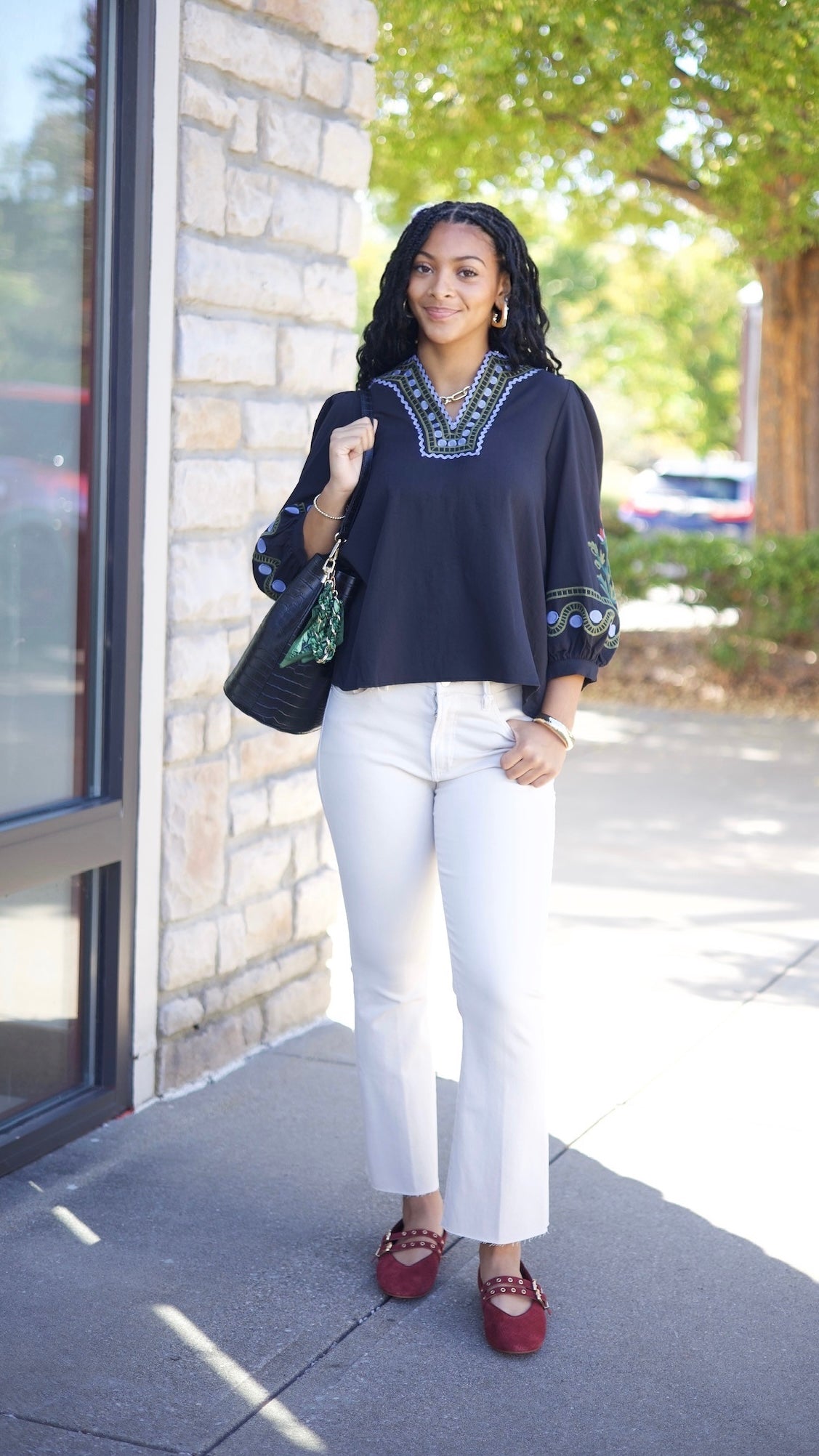The Emmy Top is a stylish fall essential featuring a black body with long periwinkle floral sleeves accented by charming ric rac trim. This chic design offers a cute and elegant look perfect for layering or wearing on its own during cooler days, bringing a fresh and fashionable touch to your wardrobe.