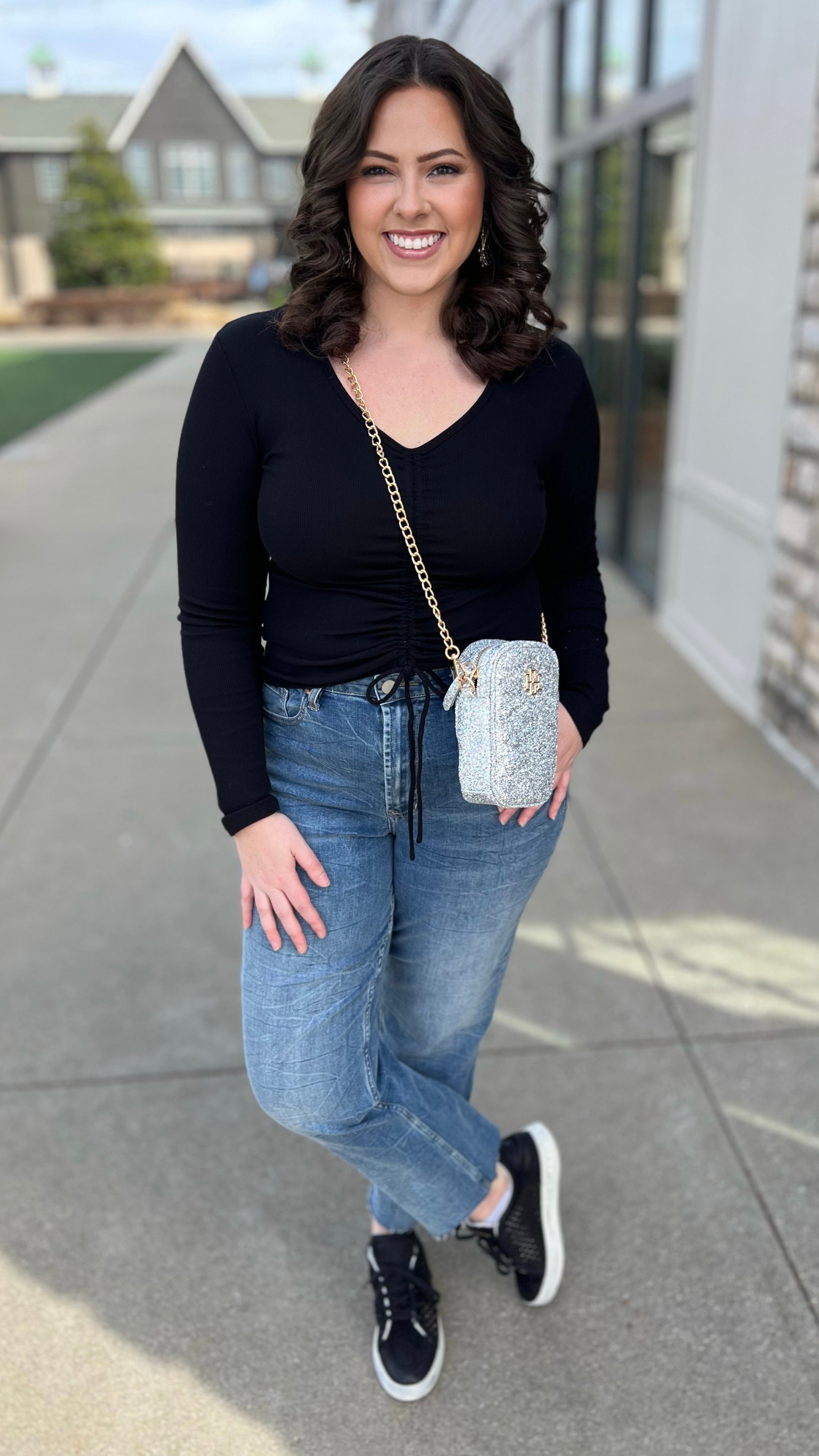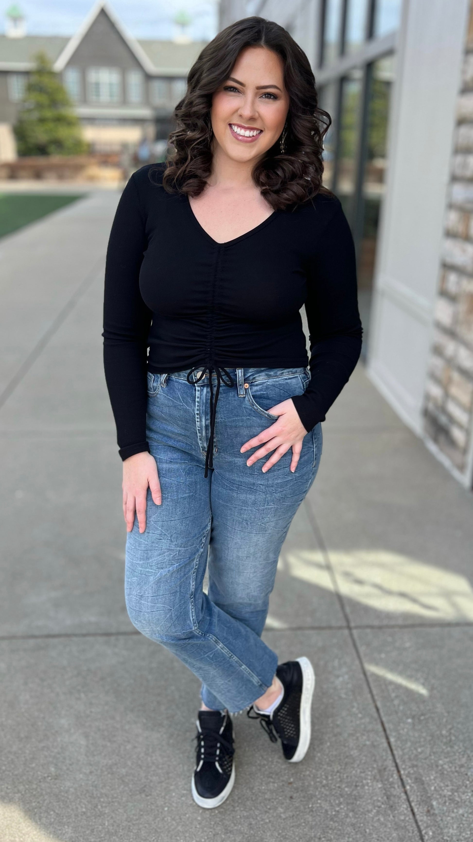 The Bobi Shirred Tie V-Neck Ribbed Top in Black is a flattering basic that offers both comfort and style. Made from high-quality ribbed fabric, this top hugs your curves in all the right places while the shirred tie detail at the V-neck adds a touch of elegance. A must-have for any wardrobe.