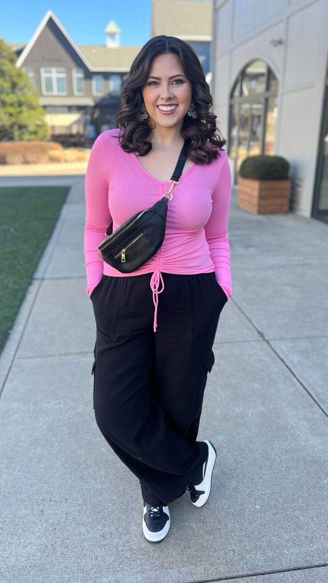 Bobi Shirred Tie V-Neck Ribbed Top - Bright Pink