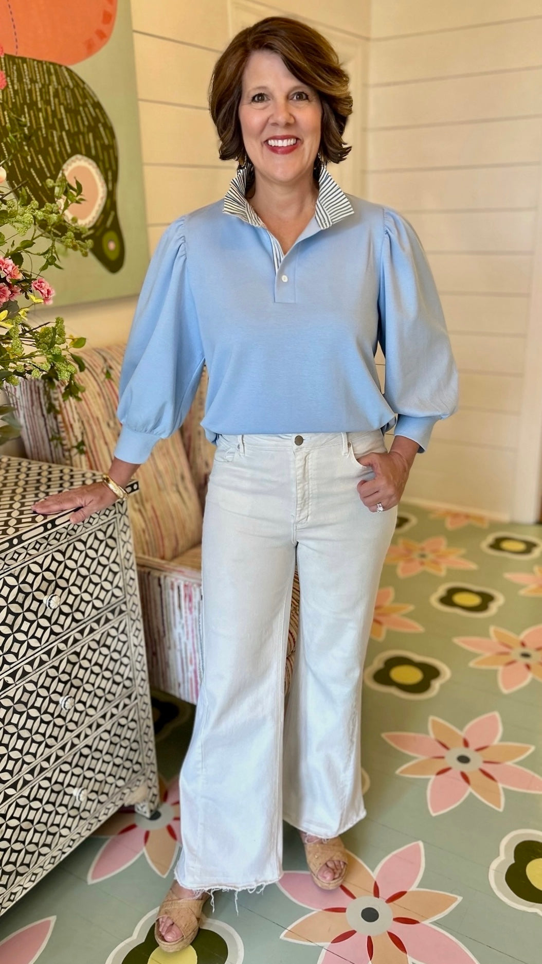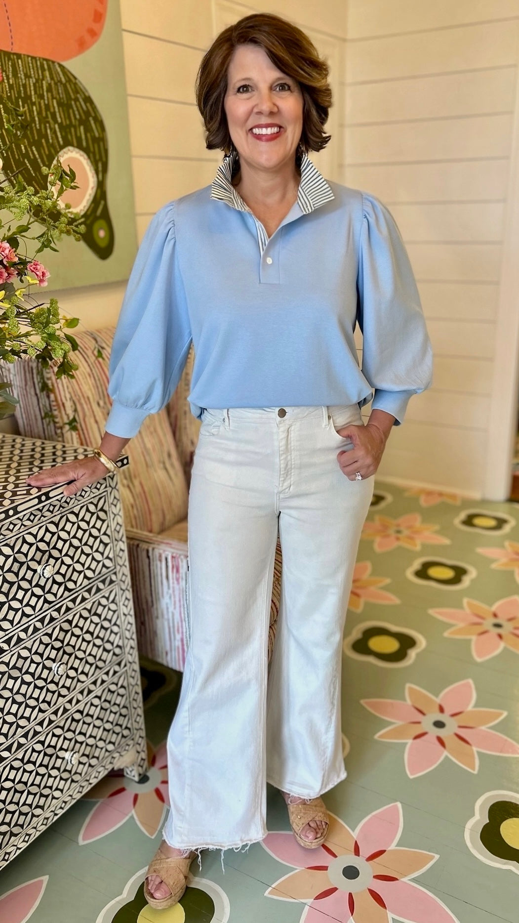 Step into spring with our Callie Pullover Top! With cute stripe details and a refreshing blue color, this versatile top is perfect for any occasion. Just pull on and go for an easy, stylish look. Say hello to your new go-to top!