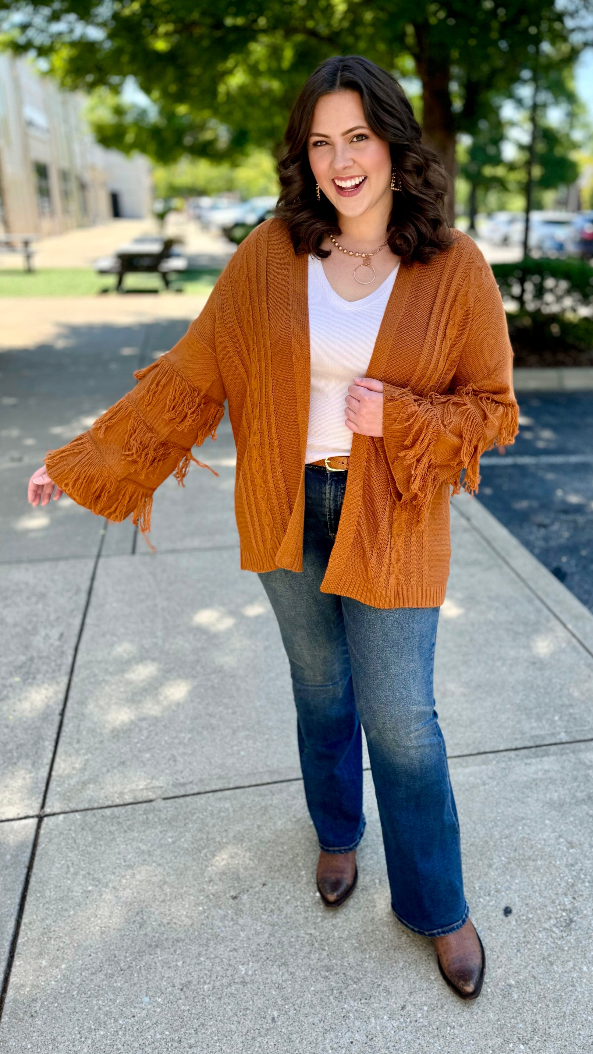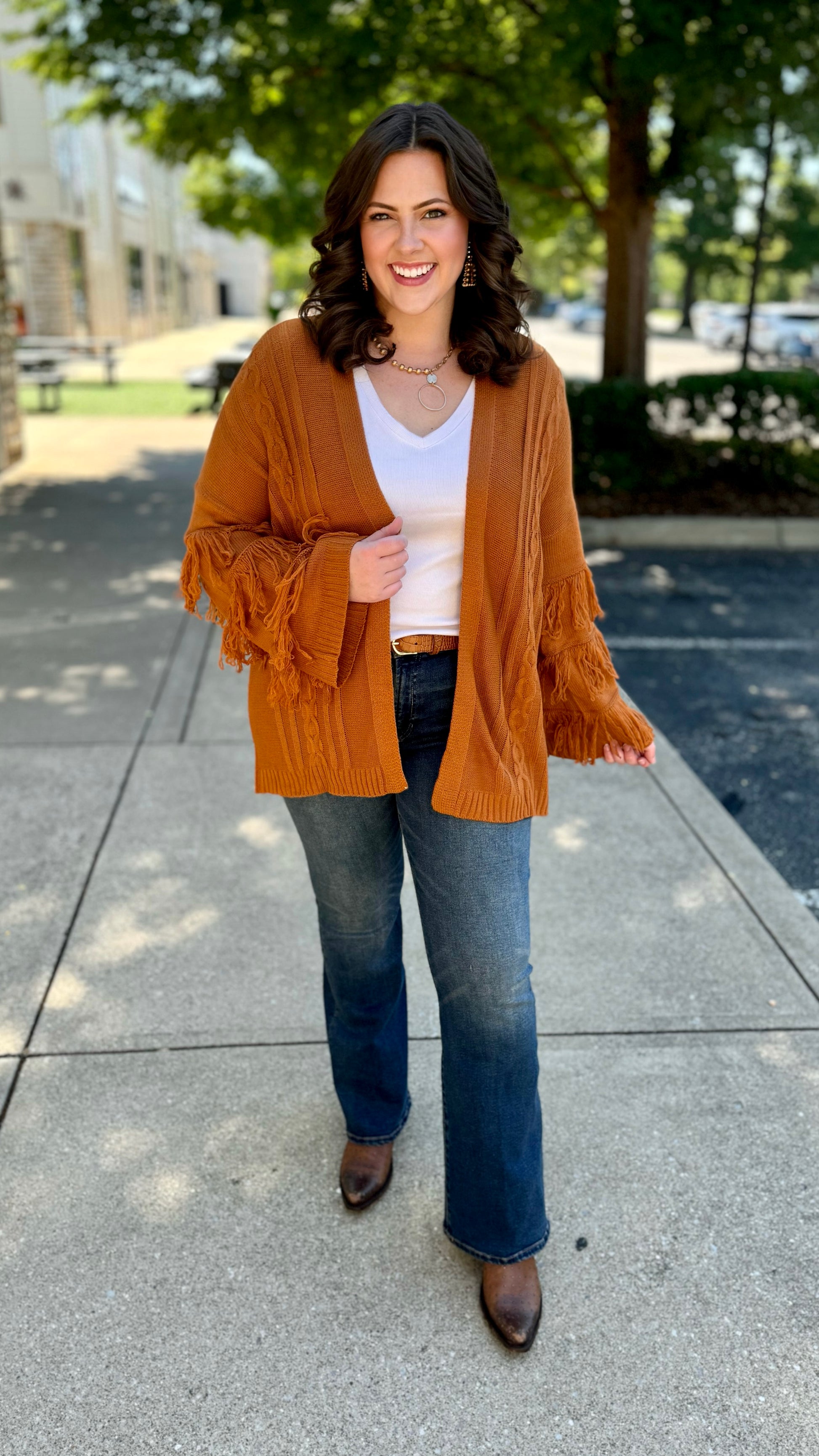 Elevate your wardrobe with our Camel Fringe Sleeve Cardigan. The stylish fringe sleeves add a touch of bohemian charm to any outfit. Made with high-quality materials, this cardigan offers both comfort and elegance. Perfect for any occasion, it's the perfect addition to your wardrobe.
