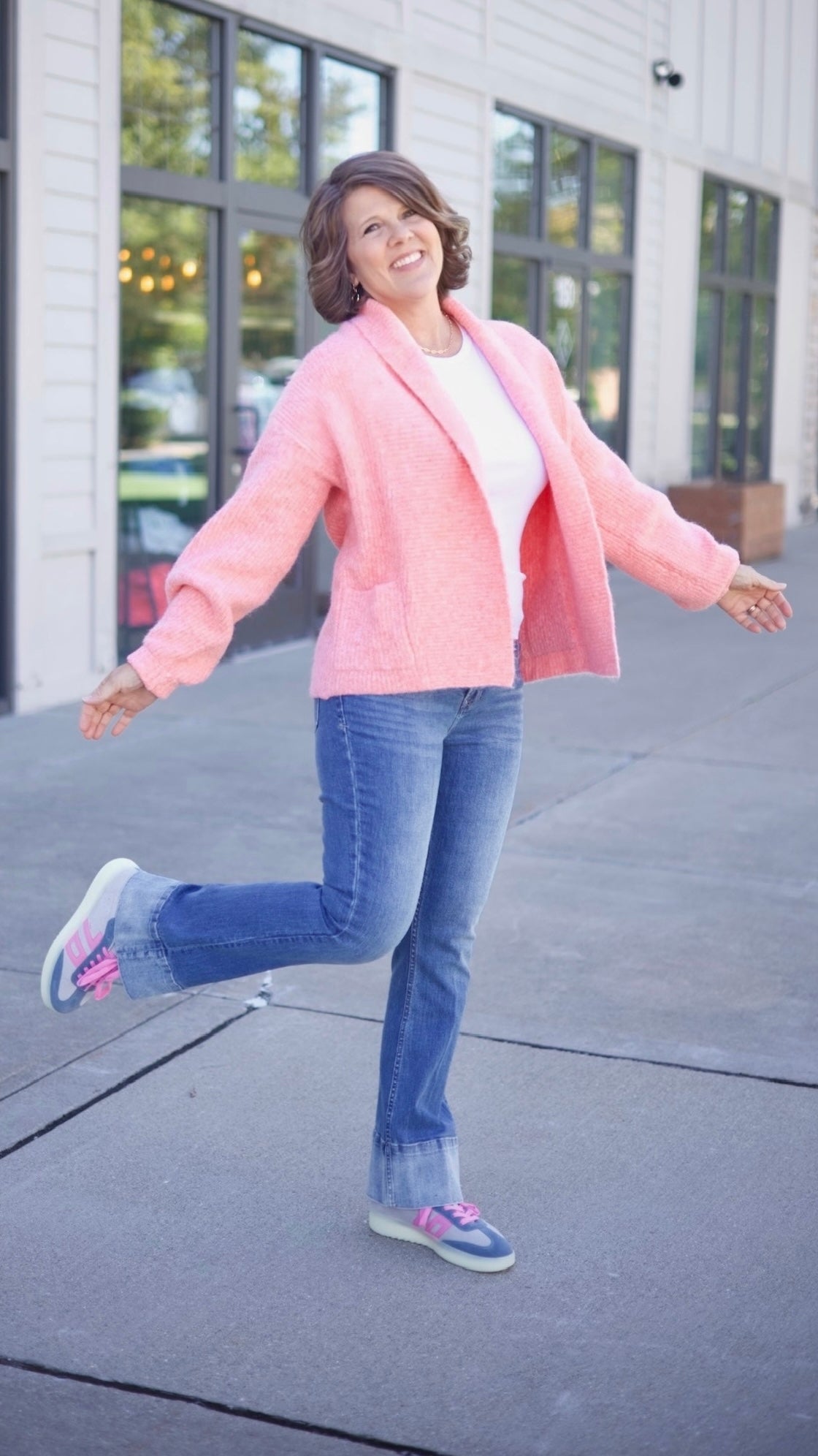 Kelly typically wears a Small/Medium in tops, and a Medium in bottoms (size 28 jeans).
