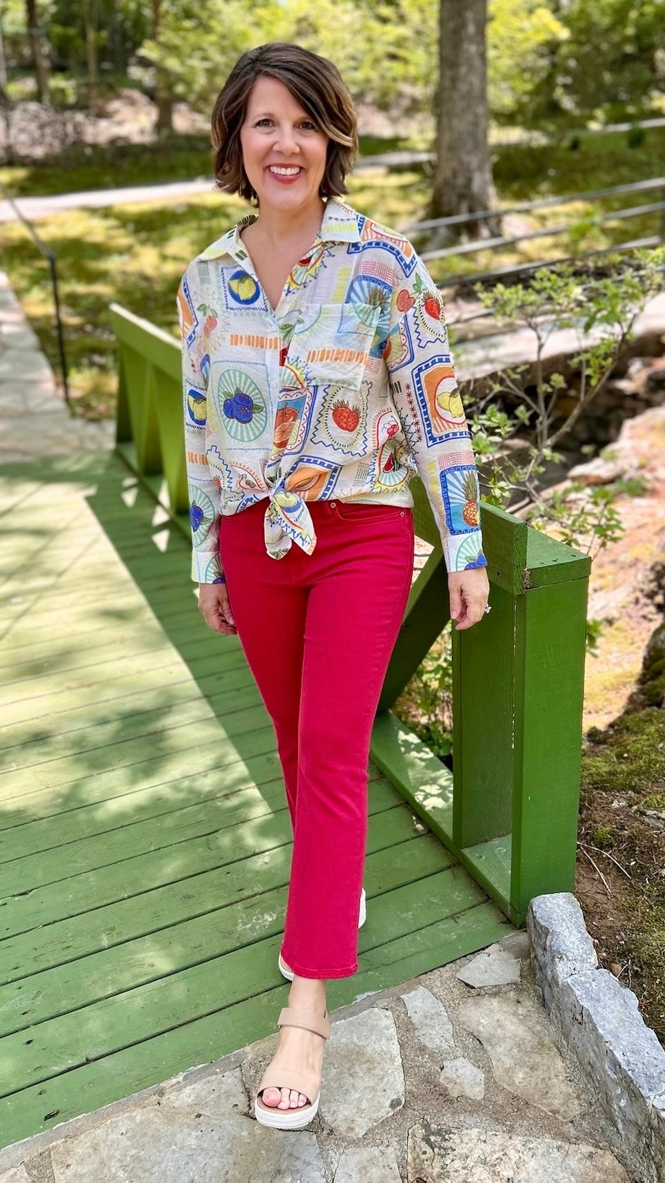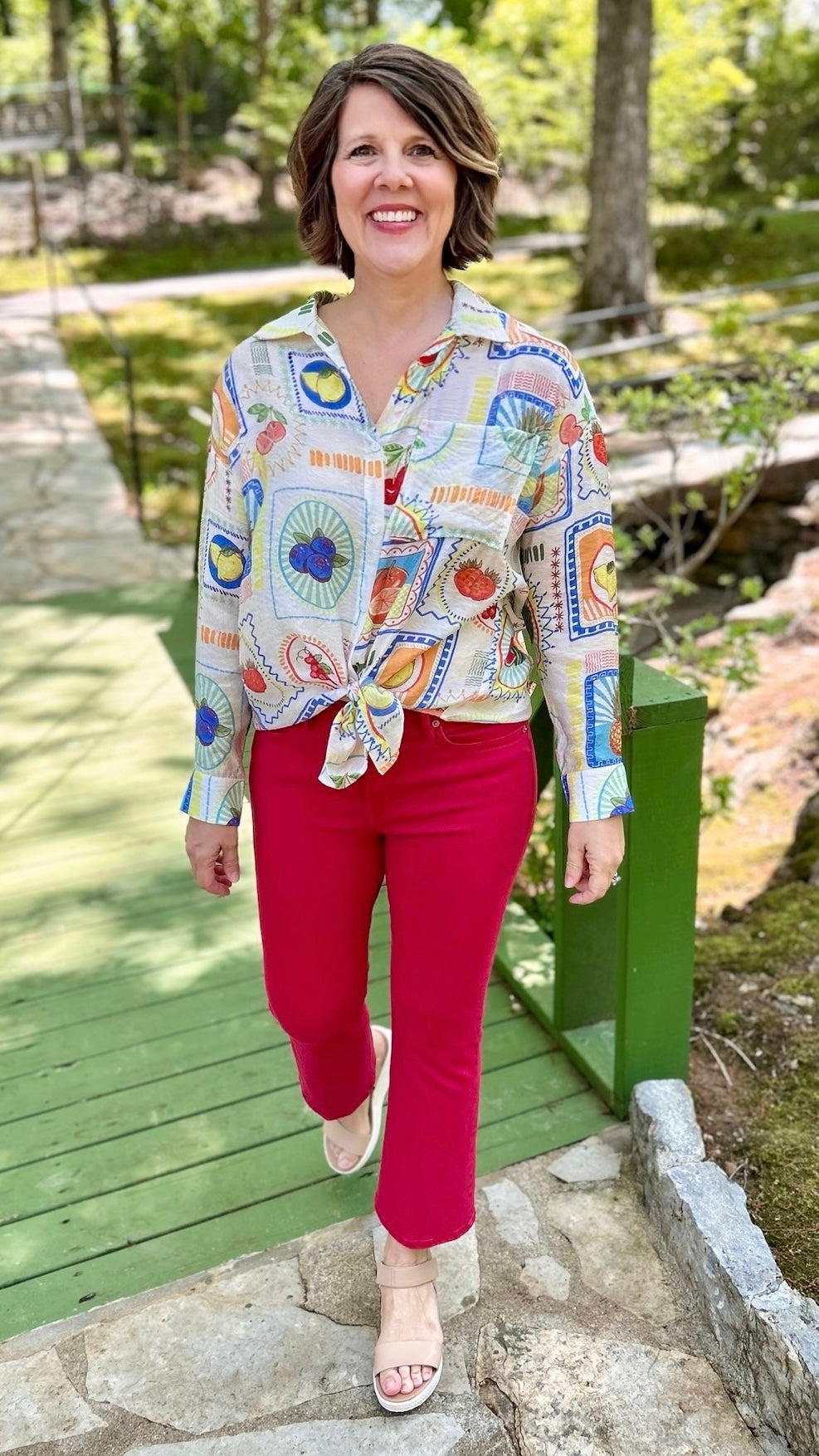 Kelly typically wears a Small/Medium in tops, and a Medium in bottoms (size 28 jeans).