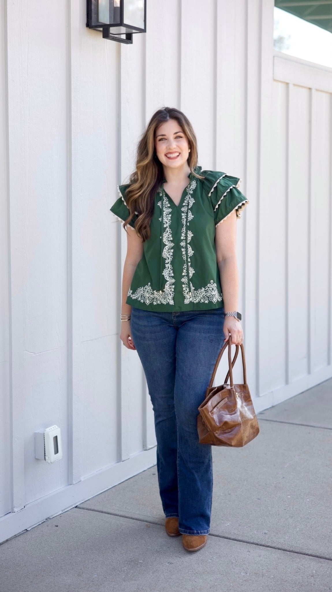The Lainey Top in green features elegant white embroidery that adds a refined, stylish touch perfect for fall. Its rich hue complements the season’s palette, making it a versatile and chic addition to your autumn wardrobe.