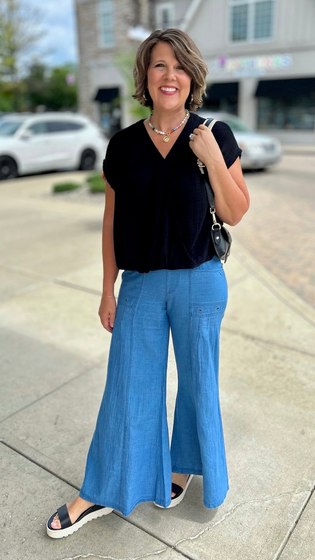 Kelly typically wears a Small/Medium in tops, and a Medium in bottoms (size 28 jeans).