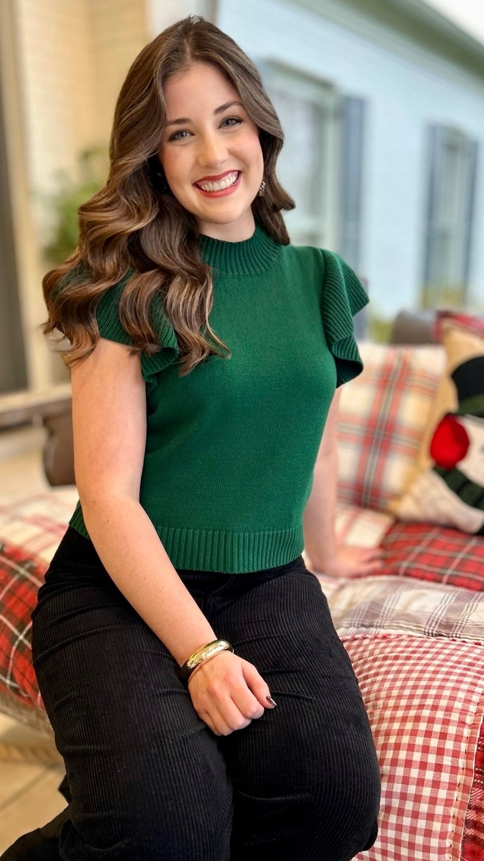 Introducing our Flutter Sleeve Sweater in Hunter Green. Made for comfort with a flattering fit, this sweater is perfect for any occasion. The flutter sleeves add a unique touch, while the rich hunter green color adds a pop of sophistication. Elevate your wardrobe with this must-have piece.