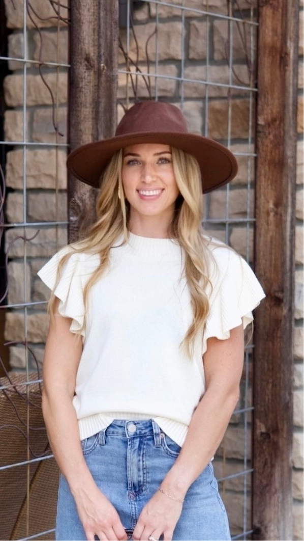 Elevate your wardrobe with the Celine Flutter Sleeve Sweater in ivory. This stylish top features delicate flutter sleeves and a soft, cozy knit that blends comfort with charm. Its versatile design pairs effortlessly with jeans or skirts, making it perfect for both casual outings and dressier occasions. Add a touch of adorable elegance to your everyday look with this must-have sweater.