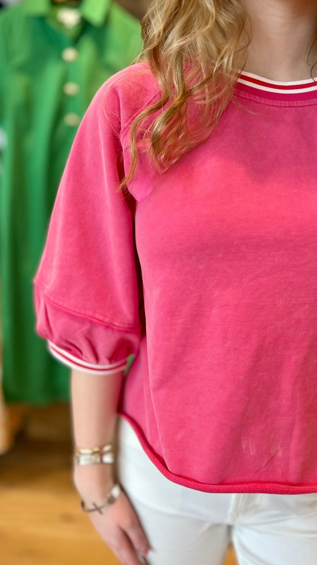 This Josie Top in fuchsia combines timeless elegance with modern details. This sophisticated piece features a gently rounded hem for a refined silhouette and a striking striped trim that frames the neckline with understated polish. Perfect for elevating your everyday wardrobe, the Josie Top transitions seamlessly from casual outings to more polished occasions.
