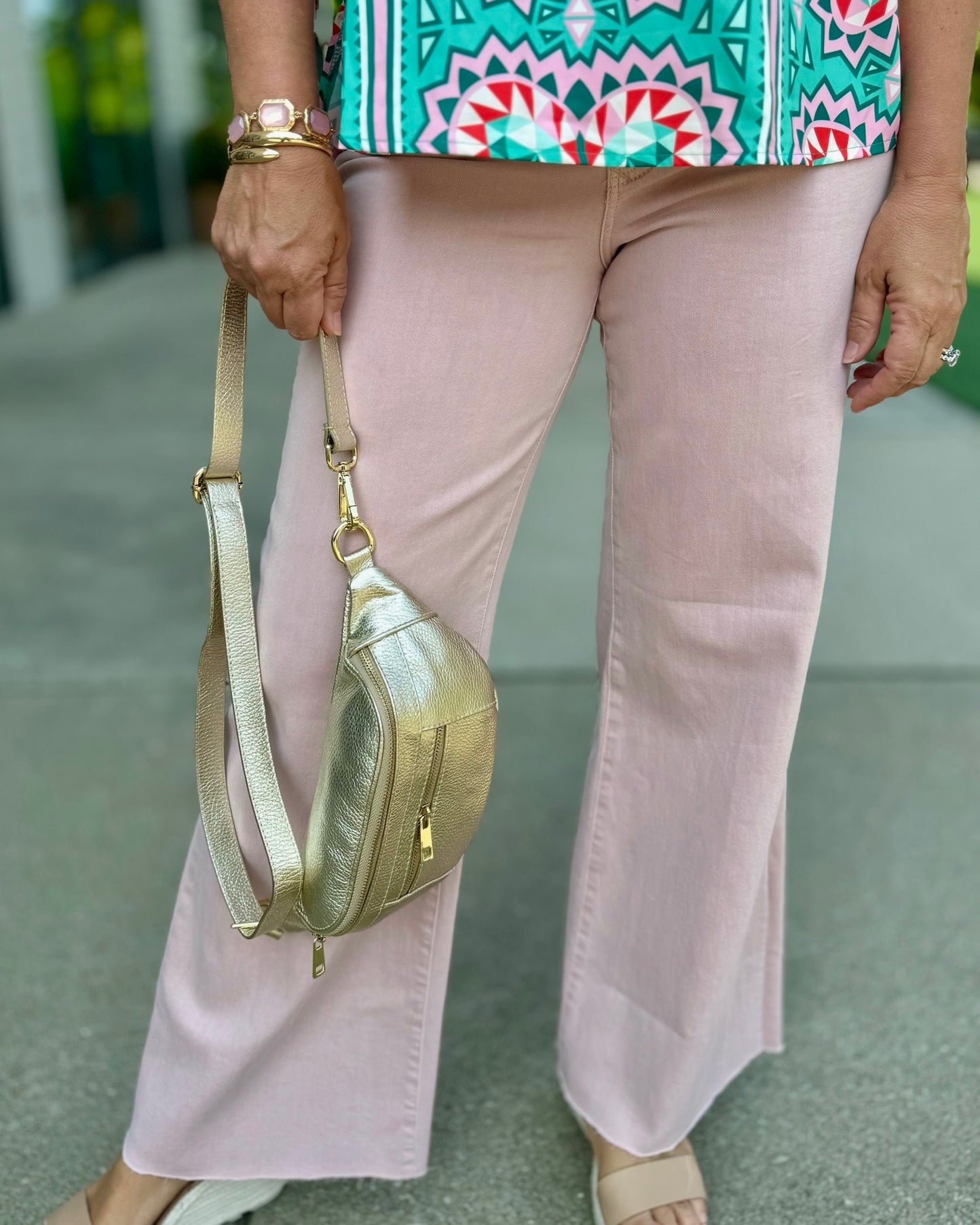 Shine bright with this playful gold leather fanny pack! Cute and compact, it’s the perfect purse to keep your essentials close while adding a touch of glam to any outfit. Wear it around your waist or across your body for a fun, hands-free style that’s ready for any adventure.