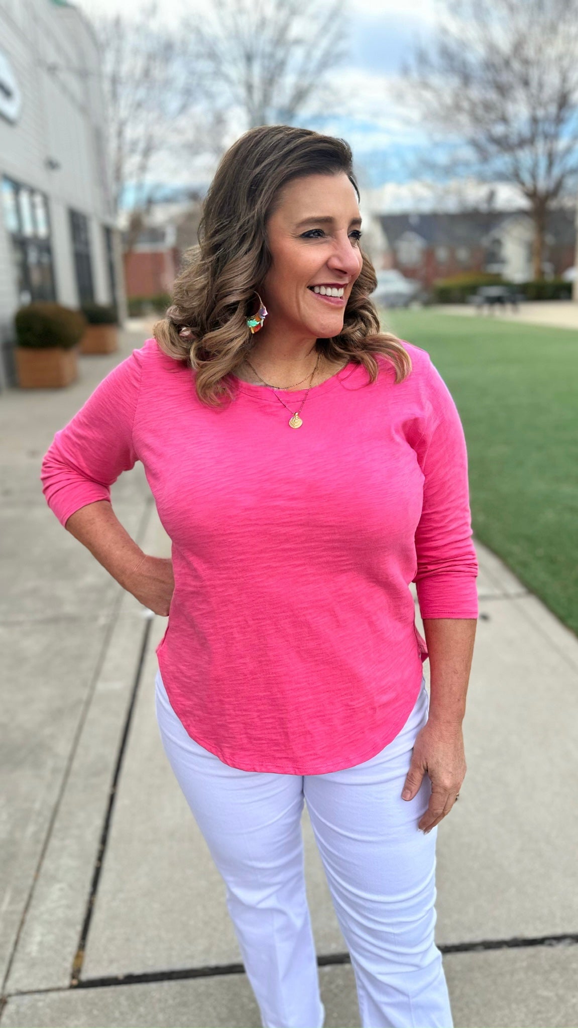 Unleash your playful side with the Habitat 3/4 Sleeve Hi-Lo Tshirt in Watermelon. This everyday shirt is perfect for layering, lightweight and oh-so comfortable. With a flattering fit for all ages, it's no wonder this is our best selling brand!