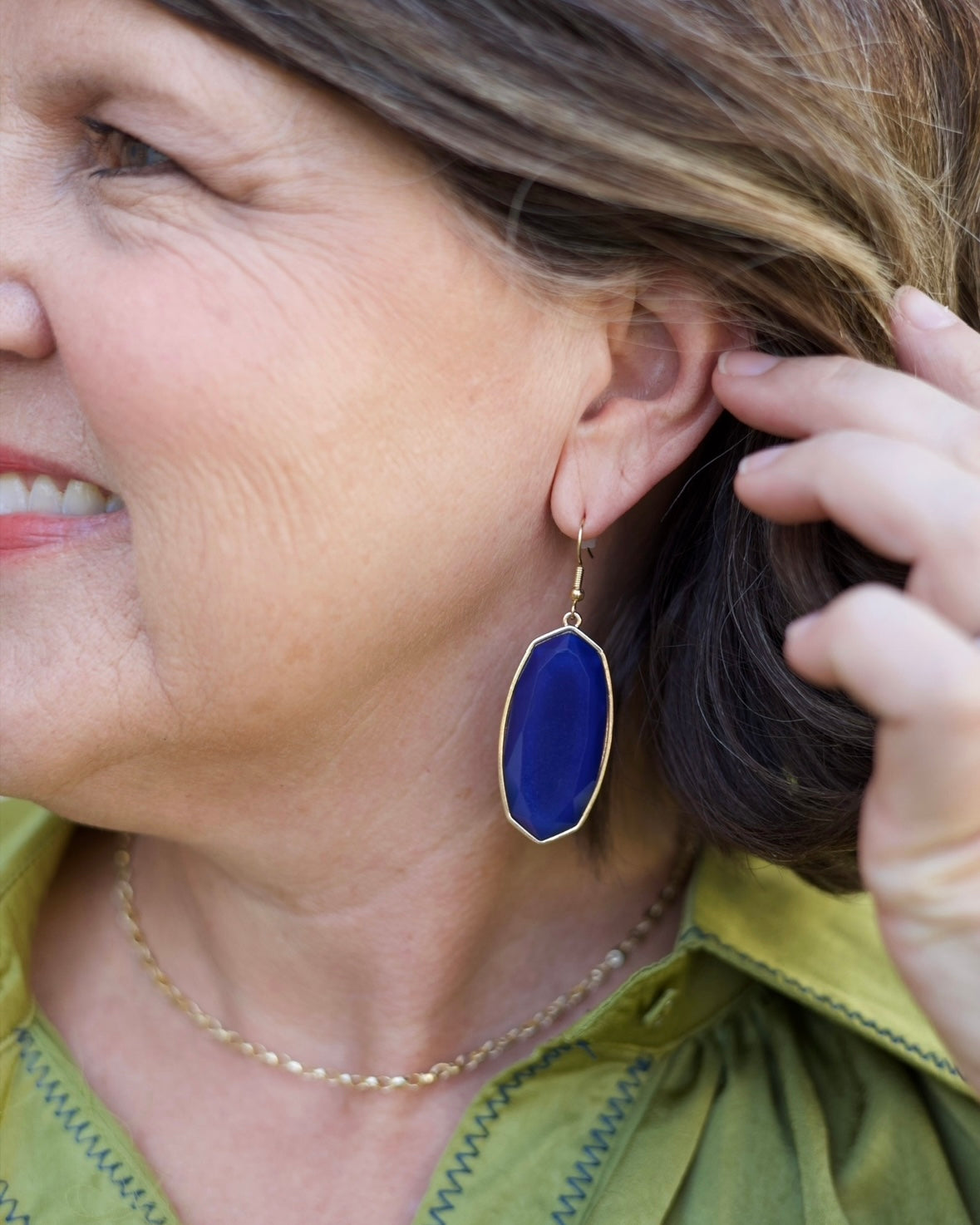These Hexagon Dangle Earrings in navy add a modern touch to any outfit. Their geometric design combined with the deep navy color creates a sleek, stylish accessory perfect for both casual and formal occasions. Lightweight and comfortable, they enhance your look with subtle sophistication.