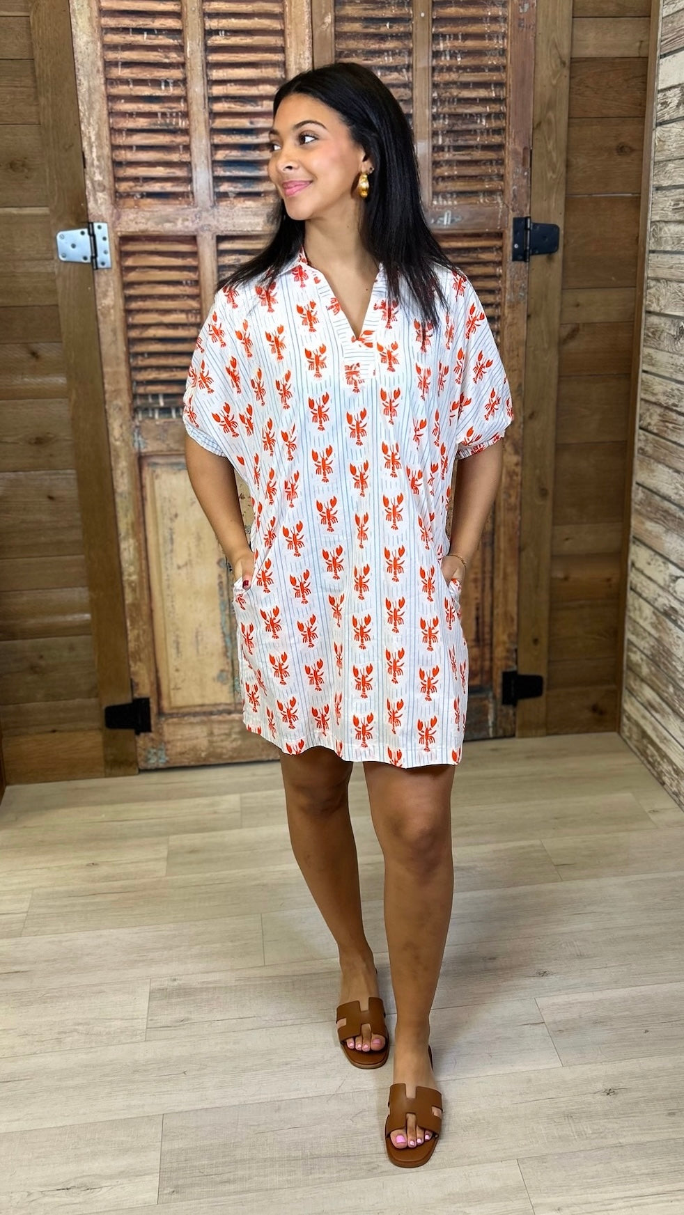 Dive into summer style with the Kate Lobster Dress, featuring a charming lobster print that captures coastal vibes. This adorable short dress is perfect for beach days, casual outings, or seaside getaways. The breezy silhouette keeps you cool and comfortable while the playful print adds personality to your wardrobe. An effortless choice for anyone craving that relaxed, beachy aesthetic.