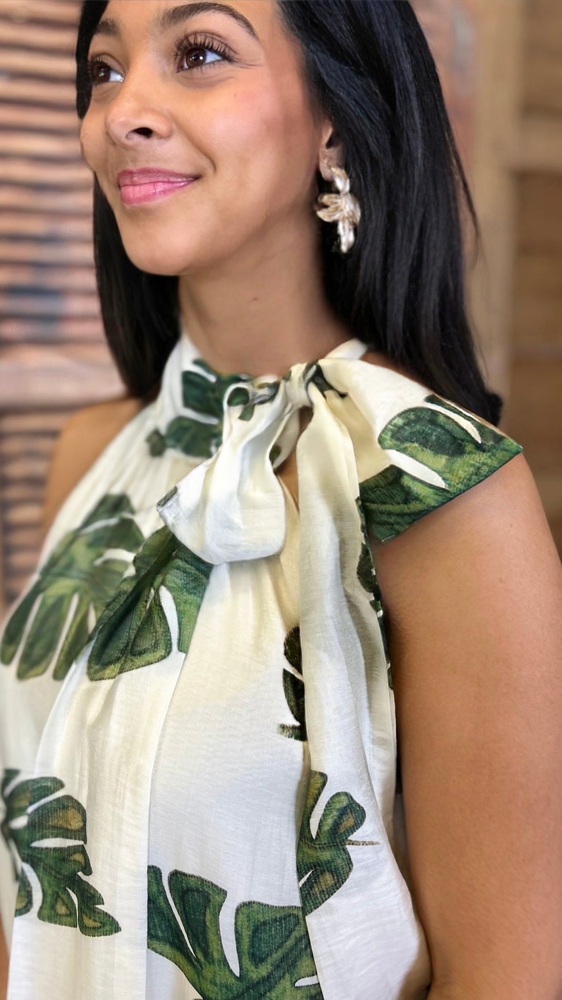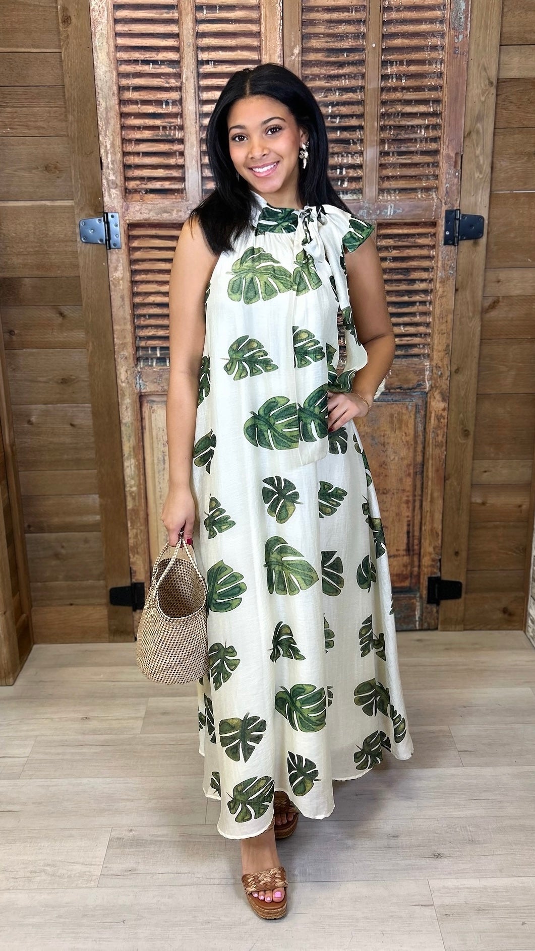 Embrace effortless elegance with the Fallon Palm Halter Dress in cream. This chic maxi features a flattering halter neckline and an all-over palm print that brings a tropical-inspired sophistication to your wardrobe. Perfect for warm-weather occasions, the flowing silhouette offers both comfort and style. Whether you're heading to a garden party or a casual evening out, this adorable piece transitions seamlessly from day to night.