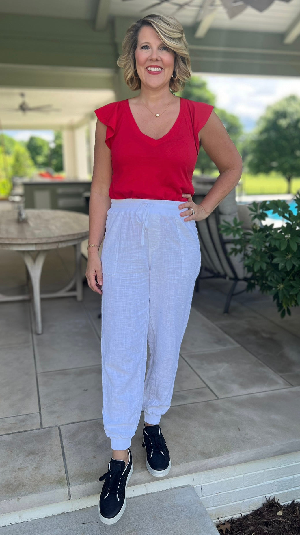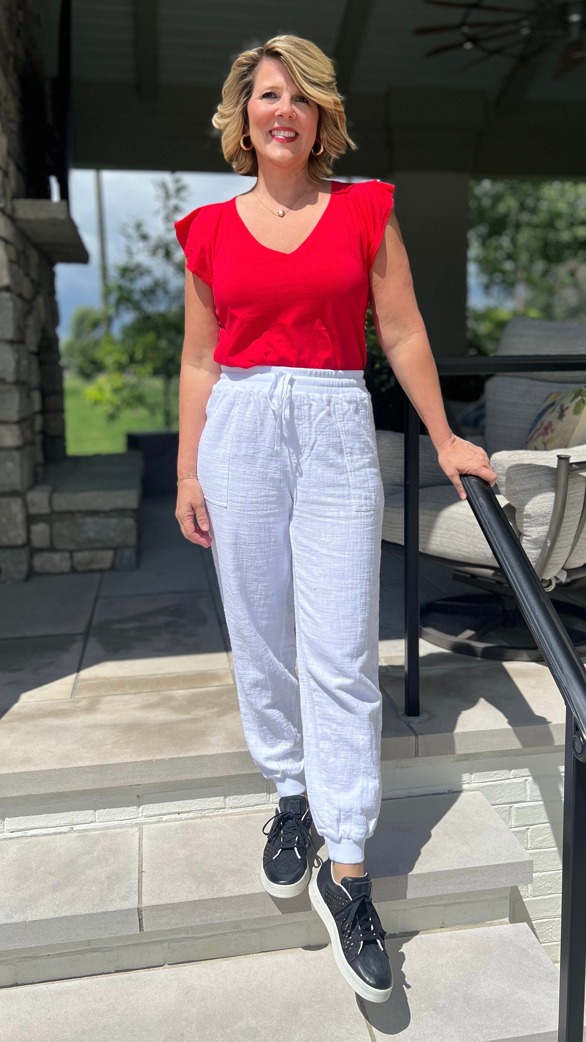 Kelly typically wears a Small/Medium in tops, and a Medium in bottoms (size 28 jeans).