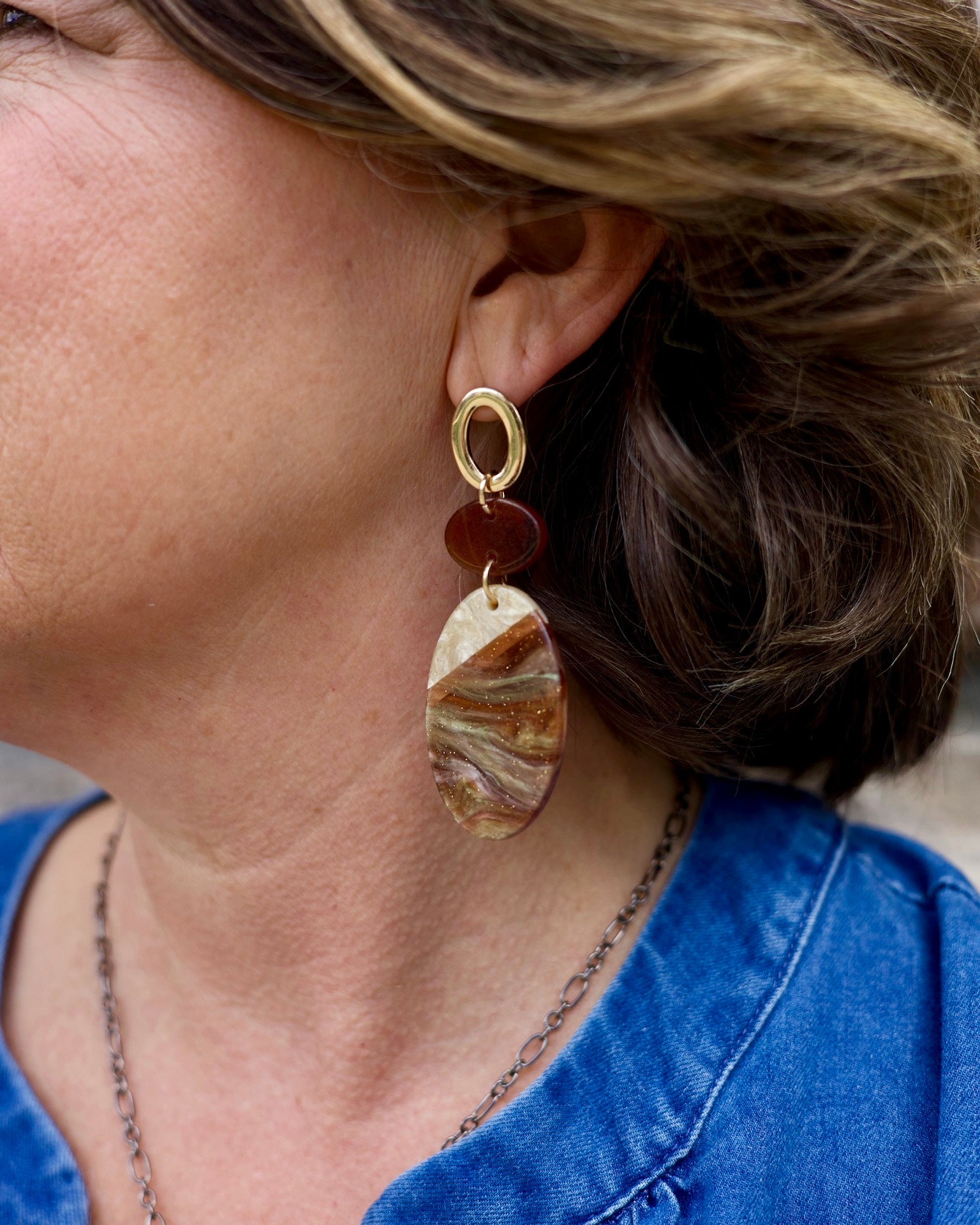 These stylish resin drop earrings feature a glittery shimmer in warm brown tones, combining circle and oval shapes for a cute and adorable look. Perfect for adding a subtle sparkle and elegant charm to any outfit.