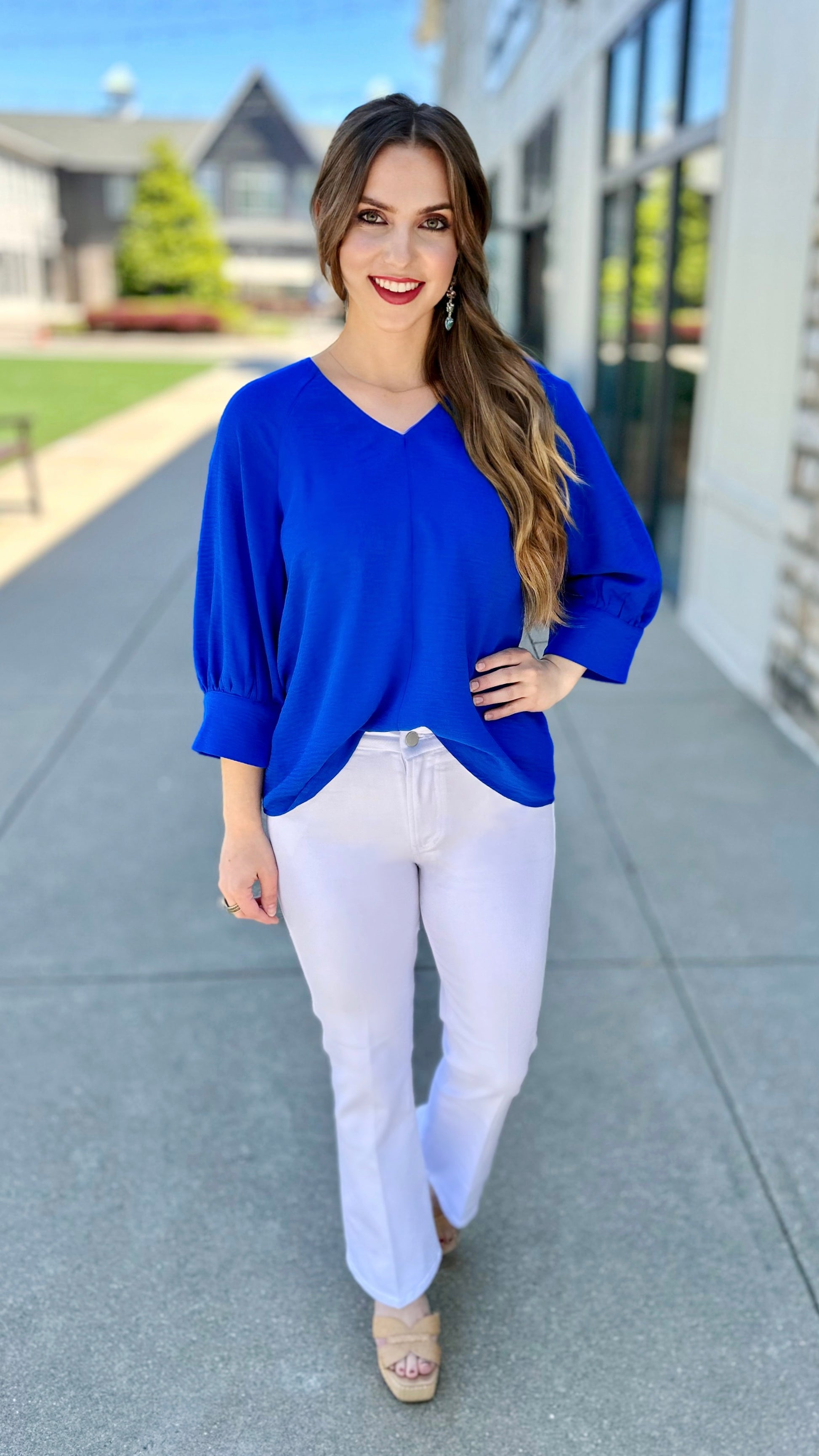Elevate your wardrobe with the Regina Royal 3/4 Sleeve Top. The V-neckline and subtle pleats on the sleeve add a touch of sophistication to this elegant piece. Perfect for any occasion, this top exudes luxury and exclusivity.
