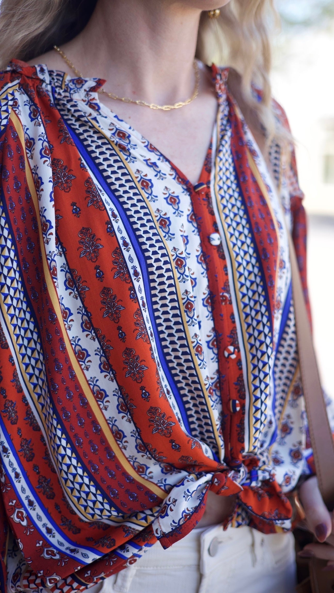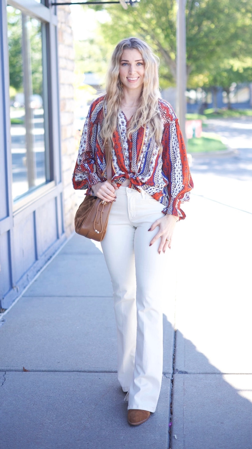 The Sophie Top blends a vibrant mix of prints with a rich rust base, creating an effortlessly stylish look. This button-up, long-sleeve design transitions seamlessly from casual to dressed-up occasions. Its colorful pattern adds a playful touch to your fall wardrobe, while the versatile silhouette ensures comfort and flair whether layered or worn alone.