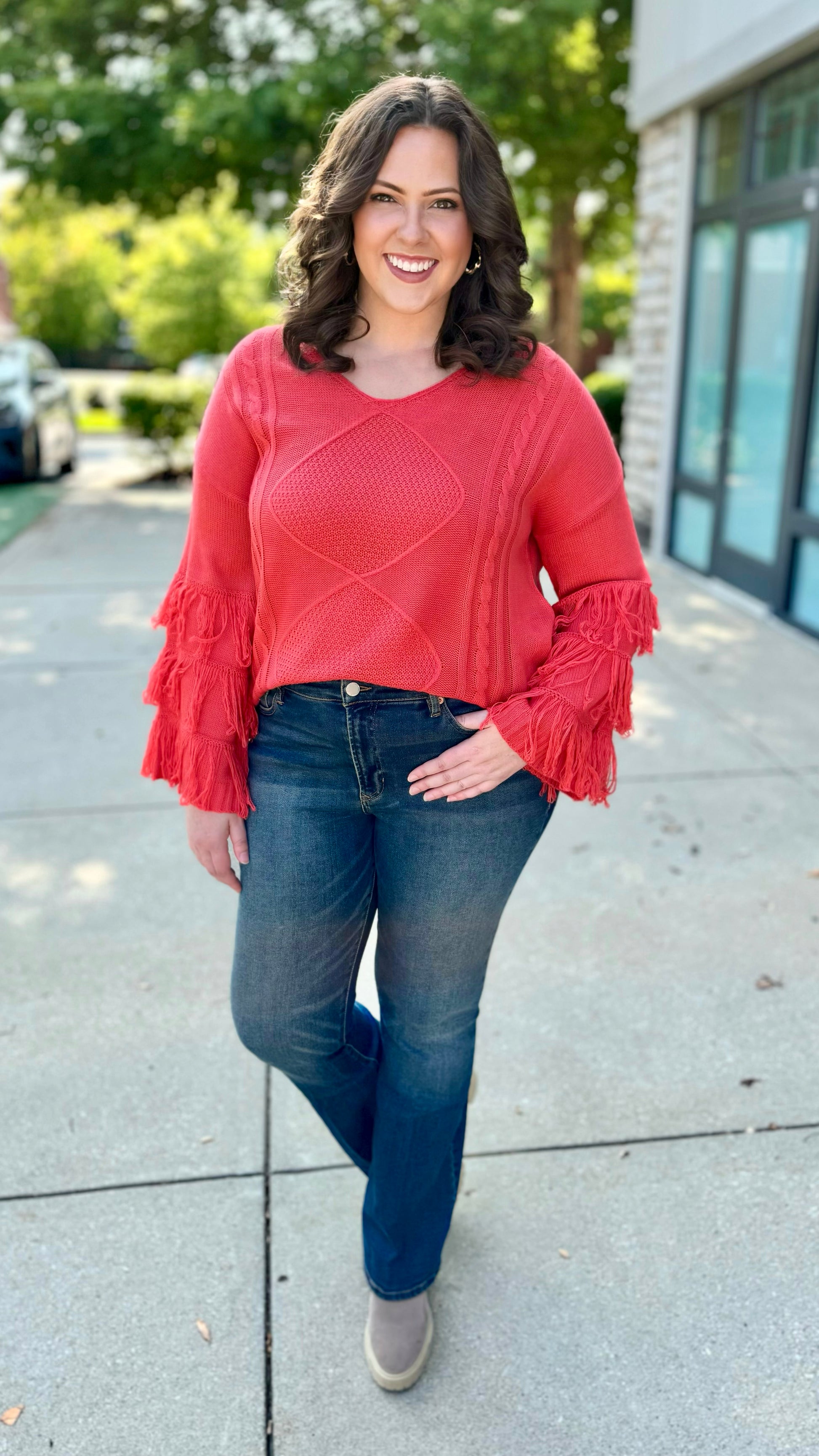 Elevate your fall wardrobe with our Sunset Fringe Sleeve Sweater. The fringe sleeves add a touch of bohemian flair while keeping you cozy and stylish. Made with quality materials and expert craftsmanship, this sweater will become a staple in your cool-weather wardrobe.