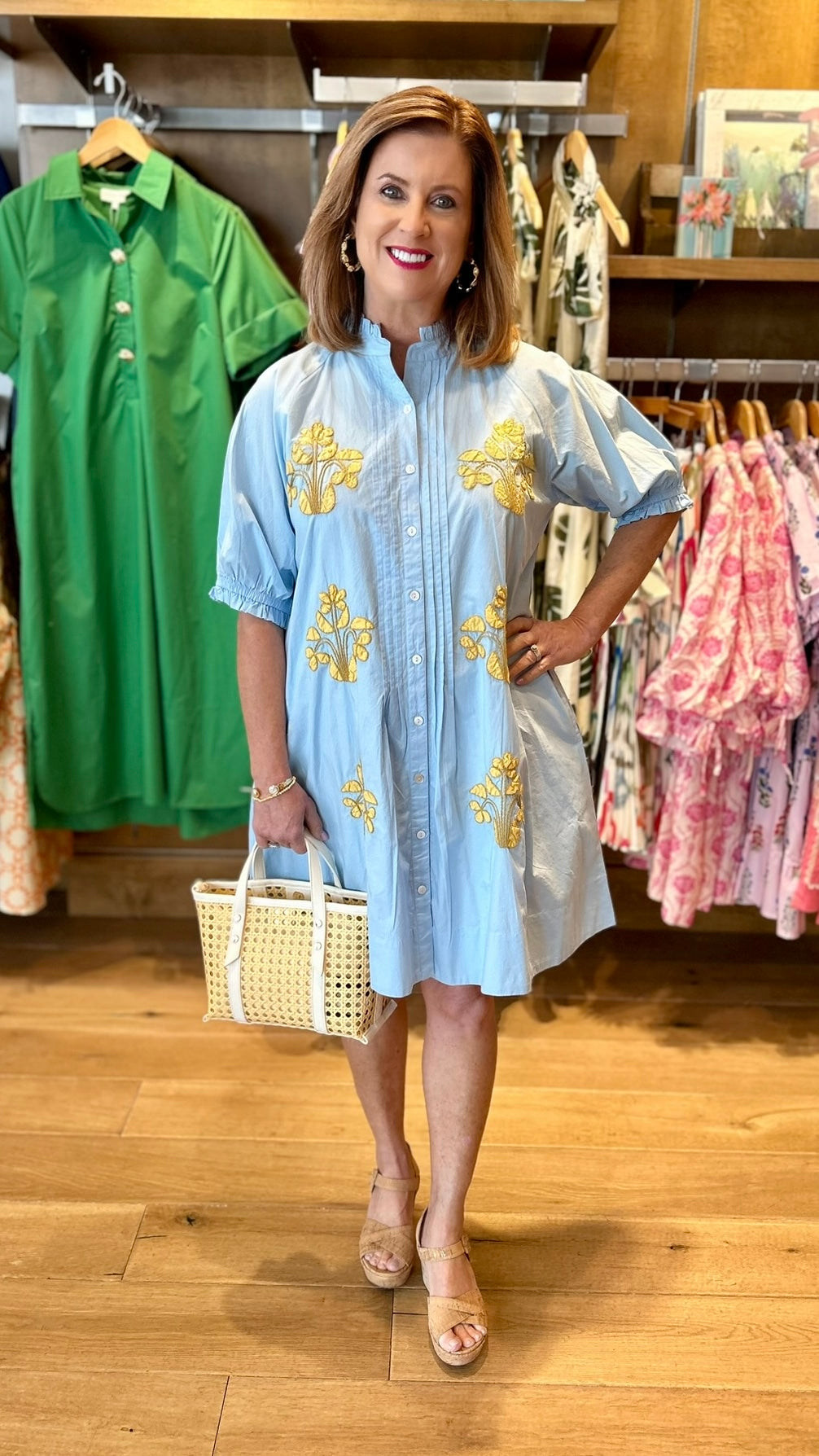 Brighten your spring wardrobe with this charming light blue dress, adorned with vibrant yellow embroidered flowers that capture the essence of the season. The effortless design transitions seamlessly from spring into summer, making it a versatile staple for warm-weather days. Comfortable and undeniably beautiful, this piece brings an instant pop of color and cheerful elegance to any occasion.