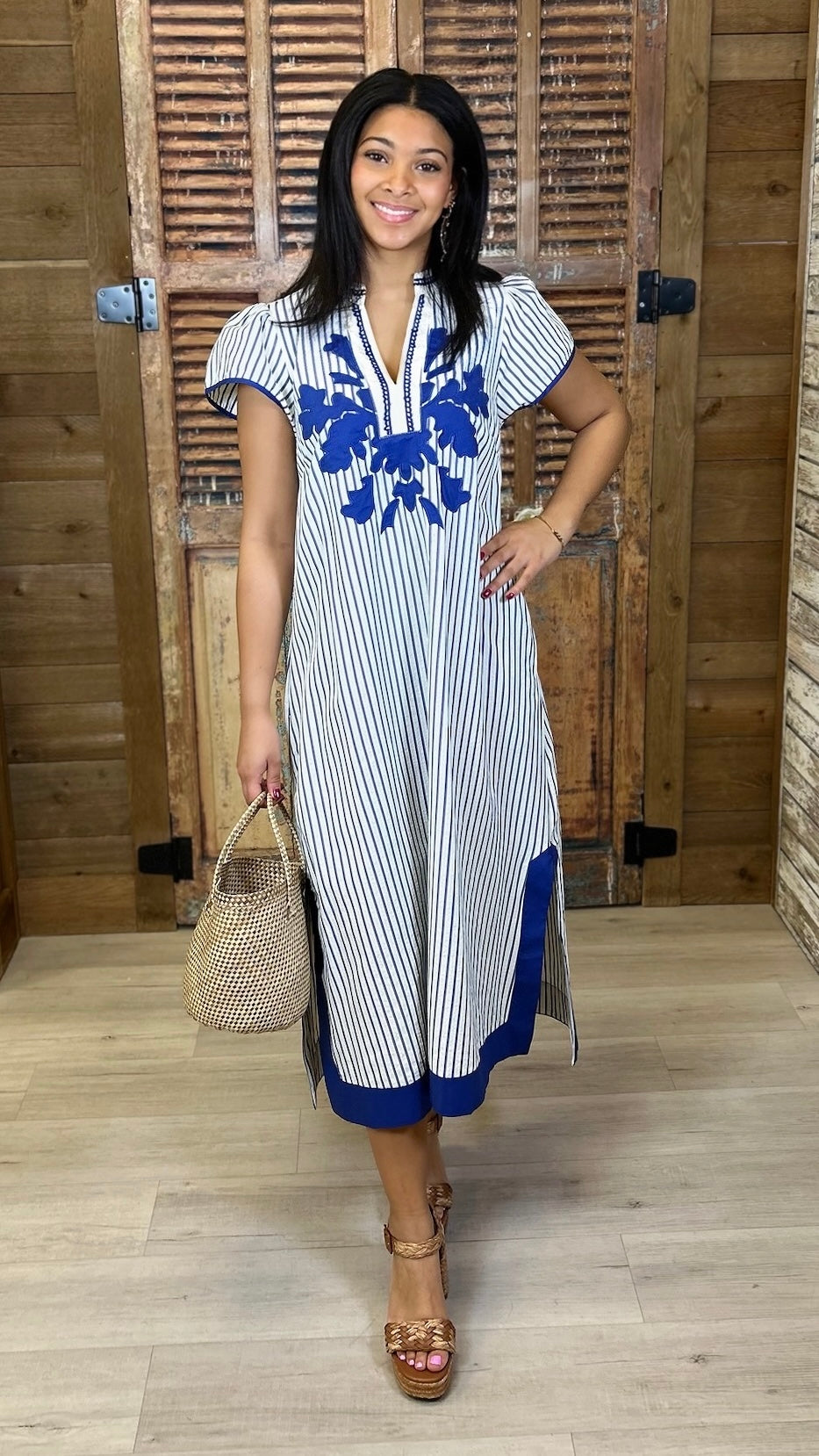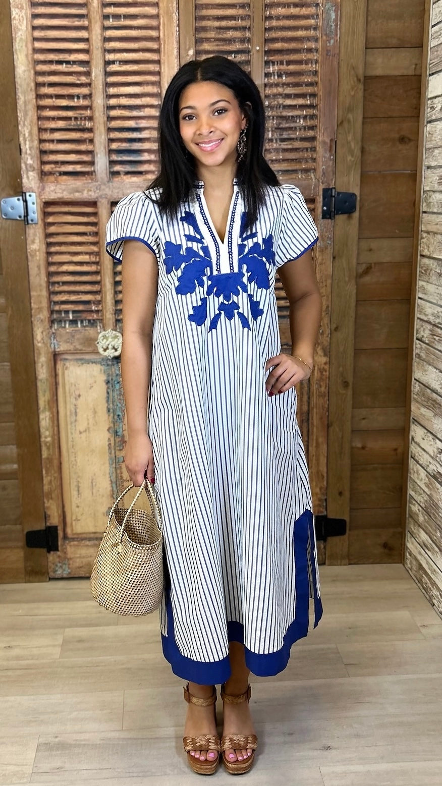 The Naomi Striped Midi Dress brings together classic seersucker charm and contemporary style. Featuring crisp white and blue stripes, this midi-length piece offers a polished look that works beautifully for everything from weekend getaways to special occasions. The lightweight seersucker fabric ensures comfort during warmer months, while the timeless striped pattern pairs effortlessly with sandals, sneakers, or dressy heels. A versatile staple that combines understated sophistication with undeniable charm.